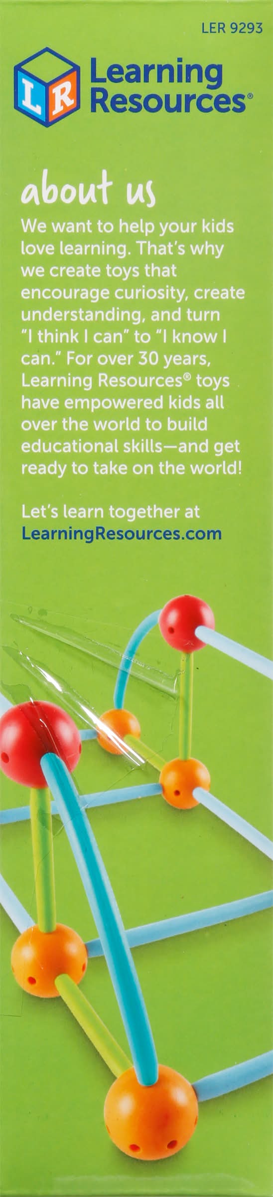Ages 5+. 3-D building challenges take shape! Develops shape identification, engineering & critical thinking skills. The world of early geometry skills takes shape with this hands-on activity set! Introduce concepts of 2-D and 3-D shapes. Geometry-themed challenges test your building ability! 58-Pieces set includes 30 sticks in 3 sizes. 12 curves. 16 connect CE listed. LearningResources.com. Learn more about our products at LearningResources.com. About us: We want to help your kids love learning. That's why we create toys that encourage curiosity, create understanding, and turn "I think I can" to "I know I can." For over 30 years, Learning Resources toys have empowered kids all over the world to build educational skills-and get ready to take on the world! Let's learn together at LearningResources.com Please retain the package for future reference. Made in China. Learning Resources, Inc.,