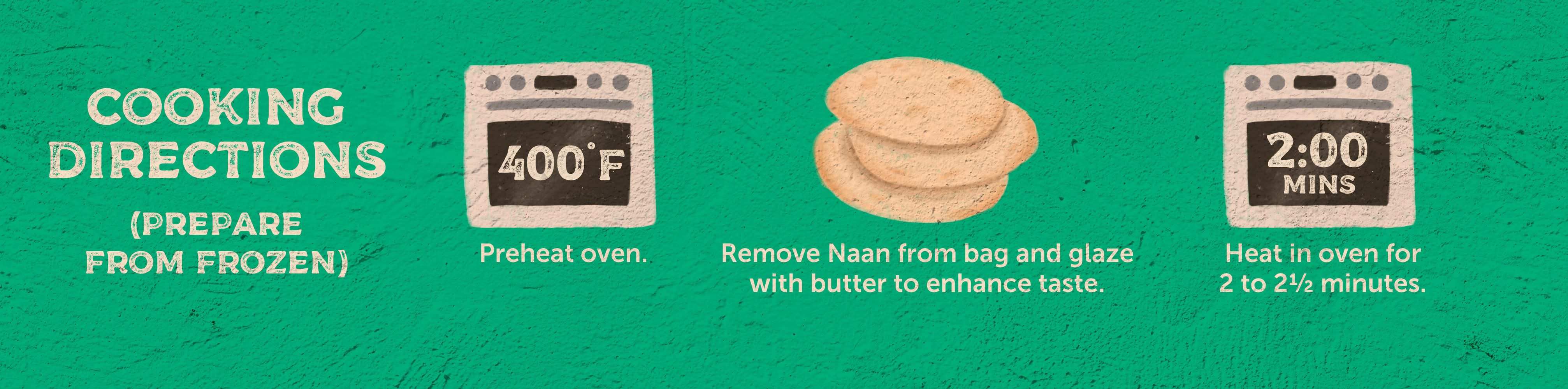 Directions for use: Cooking Directions (Prepare from frozen): 400 degrees F preheat oven. Remove Naan from bag and glaze with butter to enhance taste. 2:00 mins heat in oven for 2 to 2-1/2 minutes. For a complete experience, pair with our: potato and pea samosas & spinach paneer. Keep frozen. Storage recommendation: Keep frozen.