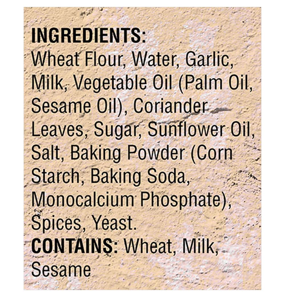 Ingredients: Wheat Flour, Water, Garlic, Milk, Vegetable Oil (Palm Oil, Sesame Oil), Coriander Leaves, Sugar, Sunflower Oil, Salt, Baking Powder (Corn Starch, Sodium Bicarbonate, Monocalcium Phosphate), Spices, Yeast Contains: Wheat, Milk, Sesame