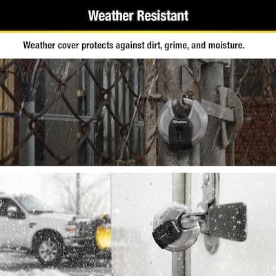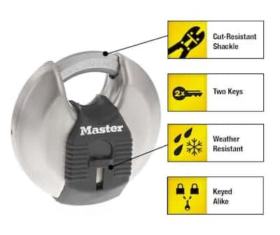 The Master Lock M40XT Heavy Duty Outdoor Shrouded Padlock with Key, Two Pack, features a 2-3/4 in. (70 mm.) wide stainless steel body for maximum strength, reliability and corrosion resistance. Padlock is fully shrouded and minimizes shackle exposure and protects against bolt cutter attacks. Octagonal lock shackle is 3/8 in. (10 mm.) in diameter and is 5/8 in. (16 mm.) long and made of Tough-Cut boron-carbide, 50% harder than hardened steel, offering maximum resistance from cutting and sawing. Keyed lock four-pin cylinder prevents picking and the dual locking ball bearings provide maximum resistance against prying and hammering. Covered lock keyway offers maximum weather protection, and reinforced body bumper protects against scratches. Master Lock's Lifetime Guarantee provides peace of mind from a brand you can trust.