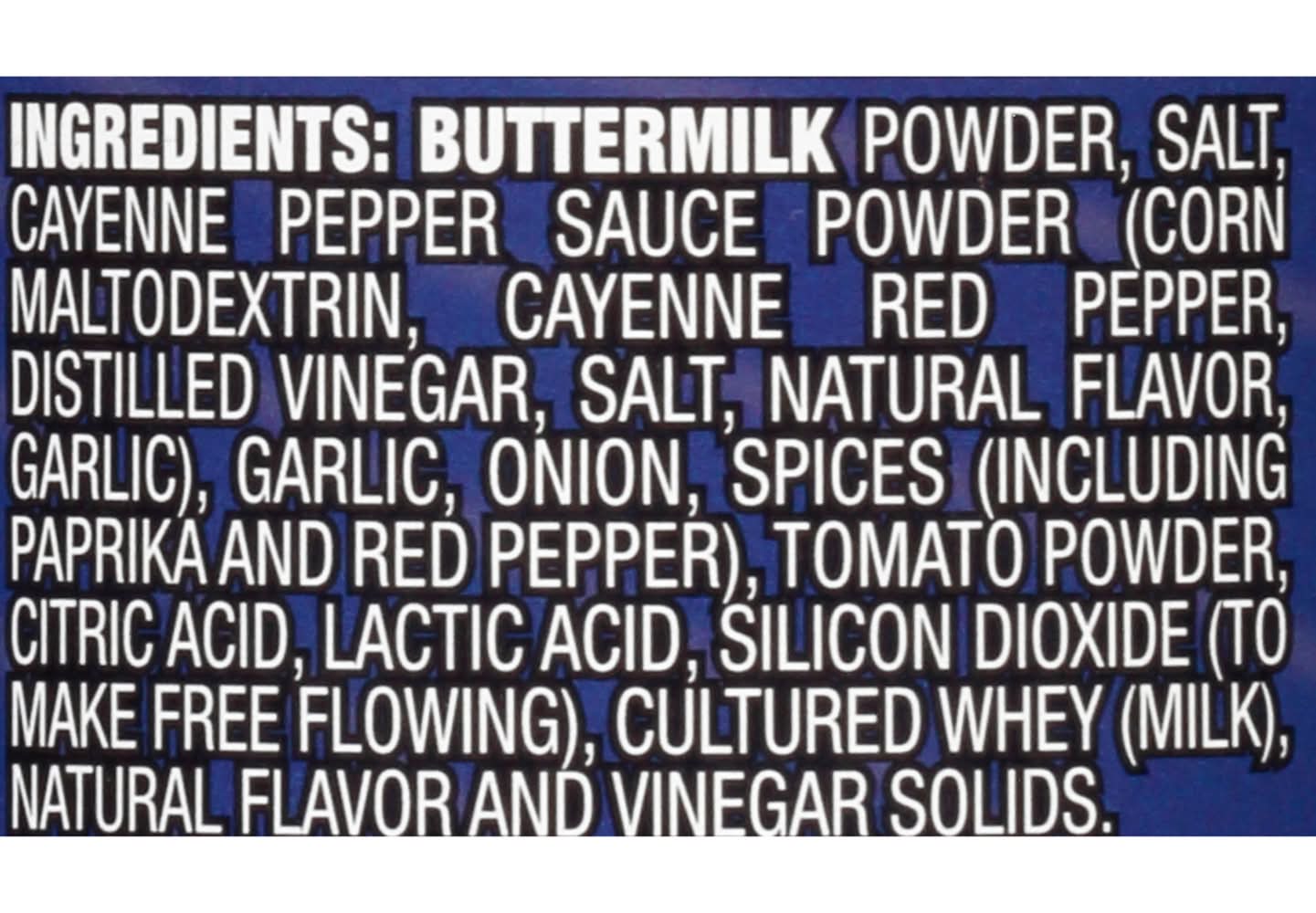 Buttermilk Powder, Salt, Cayenne Pepper Sauce Powder (Corn Maltodextrin, Cayenne Red Pepper, Distilled Vinegar, Salt, Natural Flavor, Garlic), Garlic Onion, Spices (Including Paprika and Red Pepper), Tomato Powder, Citric Acid, Lactic Acid, Silicon Dioxide (To Make Free Flowing). Cultured Whey (Milk), Natural Flavor and Vinegar Solids. Contains: Milk Additives: None