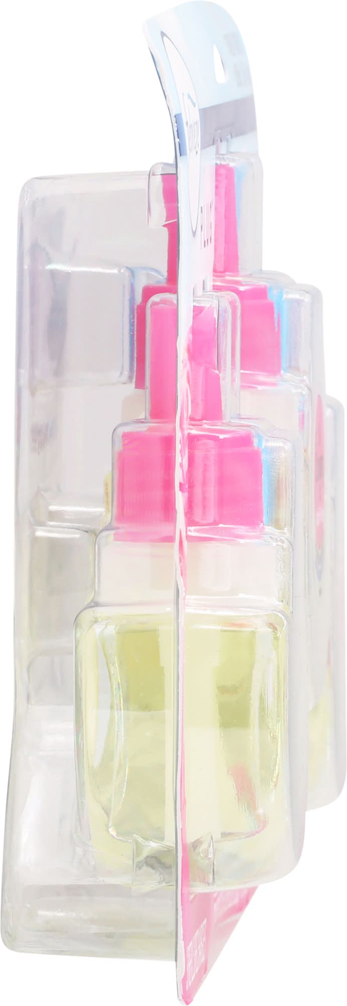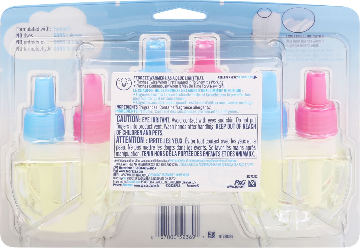 Scratch and sniff. 1st day fresh for 150 days (50 days each, on low). Febreze Warmer has a Blue Light that: flashes twice when first plugged in to show it's working; flashes continuously when it may be time for a new refill. Low Level Indicator: Blue light flashes when it might be time to refill. • Pack size: 3 • Size: 3 CT • Procter & Gamble, Cincinnati,OH,45202, • Packaging: Reusable