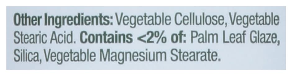 Ingredients: Other Ingredients: Vegetable Cellulose, Vegetable Stearic Acid, Contains Less than 2% of: Palm Leaf Glaze, Silica, Vegetable Magnesium Stearate
