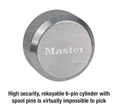 The Master Lock 6271 ProSeries Reinforced Zinc Die-Cast Rekeyable Padlock with Hidden Shackle features a 2-7/8 in. (73 mm.) wide reinforced die cast body that withstands forcible attacks and a 3/8 in. (9 mm.) diameter boron alloy shackle. Hidden shackle lock body conceals the shackle, defeating attempts to pry and cut. Ideal for transportation, vending and industrial applications, the high security, re-keyable six-pin cylinder with spool pins is virtually impossible to pick. Master Lock's Lifetime Guarantee provides peace of mind from a brand you can trust.