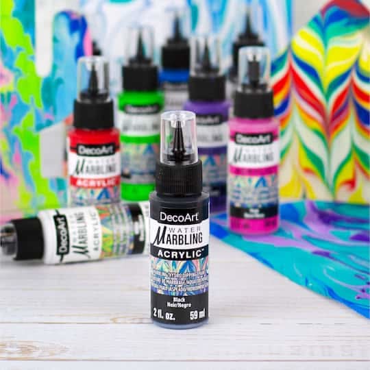 Find the Deco Art Water Marbling Acrylic Paint, 2oz. at Michaels. Water marbling is the ancient art form of using paint on the surface of the water to create mesmerizing pattern. By putting Deco Art's Water Marbling Magic Medium (sold separately) in a basin of water use can then use the Water Marbling Acrylics to create delicate and unique designs directly on the water's surface. Available in multiple colors. 2 fl. oz. (59 mL) bottle size. Easy drip tip. Requires DecoArt Water Marbling Magic Medium for use (sold separately). For indoor multi-surface use with water marbling techniques. DecoArt Water Marbling Acrylic Paint, 2oz.