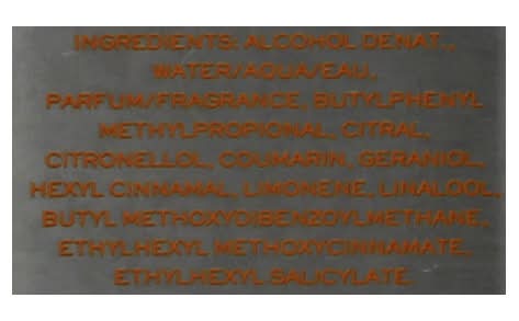 Alcohol Denat, Water/Aqua/Eau, Parfum/Fragrance, Butylphenyl Methylpropional, Citral, Citronellol, Coumarin, Geraniol, Hexyl Cinnamal, Limonene, Linalool, Butyl Methoxydibenzoylmethane, Ethylhexyl, Methoxycinnamate, Ethylhexyl Salicylate