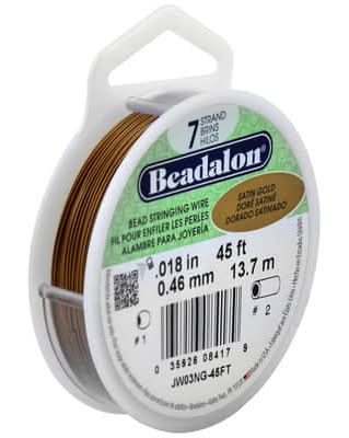 This strong bead stringing wire is composed of seven wires incorporated together within a protective, abrasion-resistant nylon coating.. 0.46 mm (.018"). 45 ft (13.7 m). Good drape. Kink and abrasion resistant. Color: Satin gold