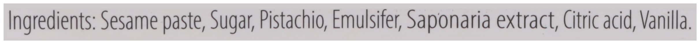 Sesame Paste, Sugar, Pistachio, Emulsifier, Saponaria Extract, Citric Acid, Vanilla Contains: Sesame, Tree Nuts, Pistachios, Tree Nuts
