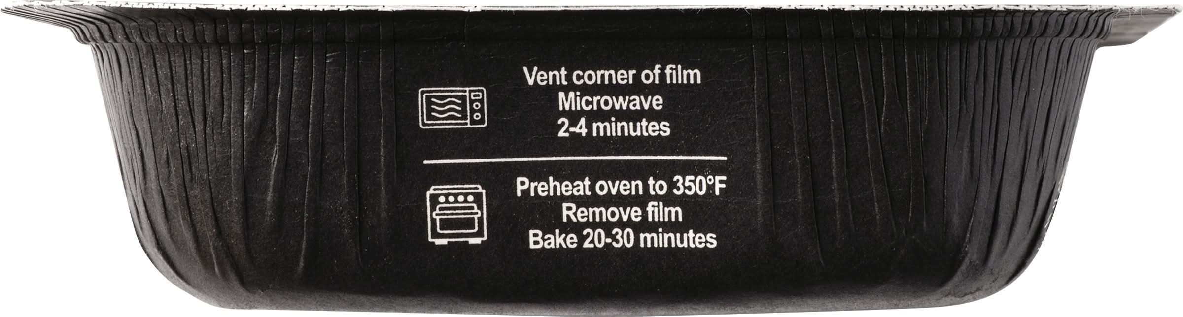 Directions for use: Directions: Microwave Oven: Vent corner of film. Heat on high 2-4 minutes depending on size of portion. Conventional Oven: Remove plastic film. Preheat oven to 350 degrees. Bake 20-30 minutes depending on size of portion. Package not suitable for toaster oven. Keep refrigerated. Storage recommendation: Keep refrigerated.