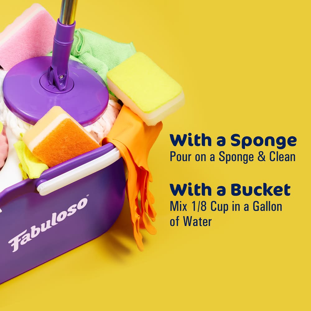 Ways to use: with a sponge: pour on a sponge and clean. with a bucket: mix 1/4 cup in a gallon of water. use fabuloso on sinks, toilets, tubs, showers, floors, sealed wood surfaces, appliances, counters, windows, mirrors, walls, doorknobs and furniture.