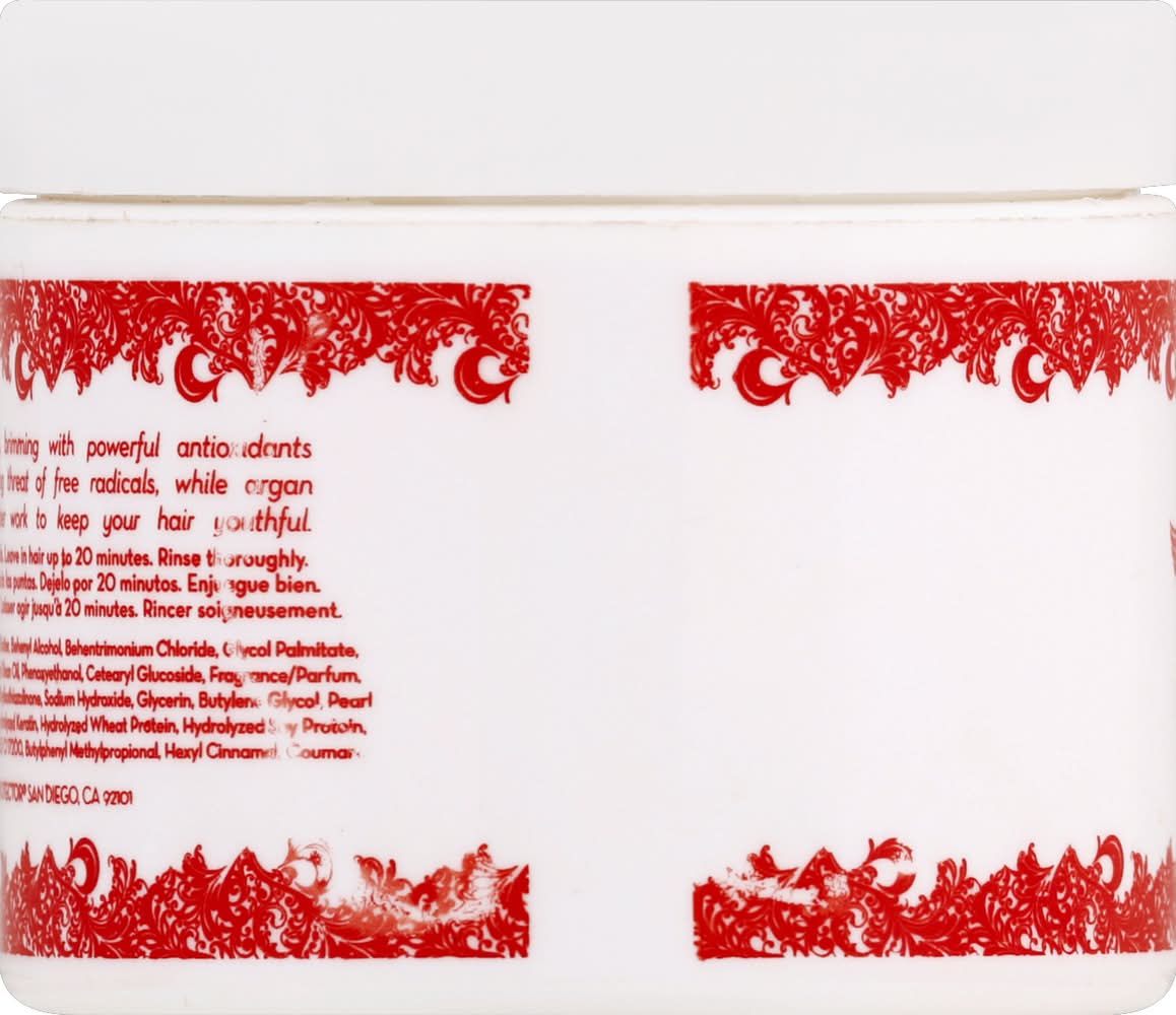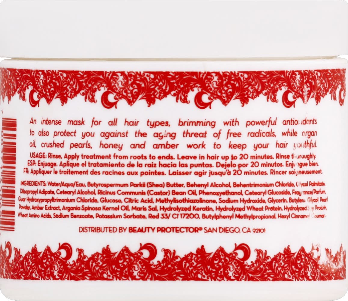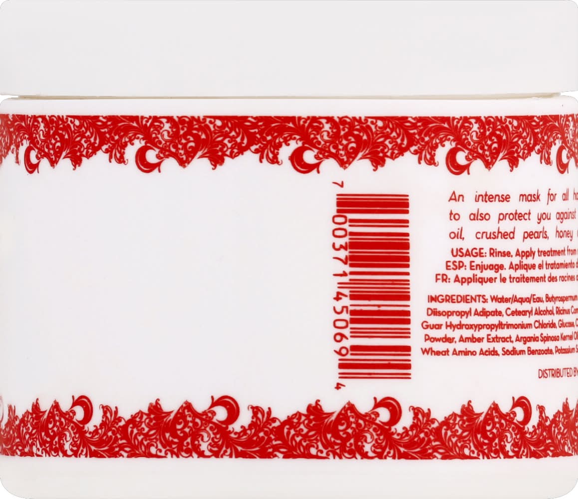 Water/Aqua/Eau, Butyrospermum Parkii (Shea) Butter, Behenyl Alcohol, Behentrimonium Chloride, Glycol Palmitate, Diisopropyl Adipate, Cetearyl Alcohol, Ricinus Communis (Castor) Bean Oil, Phenoxyethanol, Cetearyl Glucoside, Fragrance/Parfum, Guar Hydroxypropyltrimonium Chloride, Glucose, Citric Acid, Methylisothiazolinone, Sodium Hydroxide, Glycerin, Butylene Glycol, Pearl Powder, Amber Extract, Argania Spinosa Kernel Oil, Maris Sal, Hydrolyzed Keratin, Hydrolyzed Wheat Protein, Hydrolyzed Soy Protein, Wheat Amino Acids, Sodium Benzoate, Potassium Sorbate, Red 33/CI 17200, Butylphenyl Methylpropional, Hexyl Cinnamal, Coumarin Contains: Tree Nuts, Soybeans, Wheat Additives: None