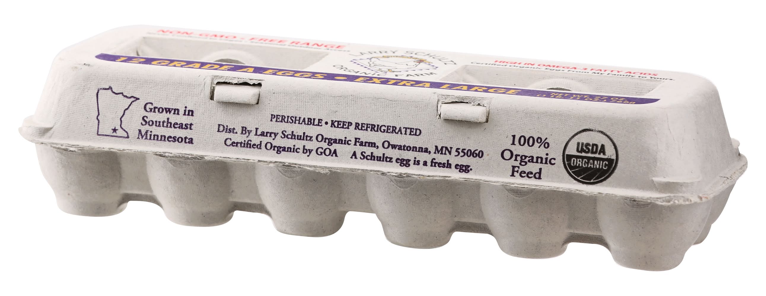 USDA Organic. Certified Organic by GOA. Certified organic eggs from my family to yours. High in omega-3 fatty acids. Non-GMO. A Schultz egg is a fresh egg. 100% organic feed. Never confined to cages. Seasonal outdoor access. Grade A. Carton made from 100% reclaimed paper. Grown in Southeast Minnesota. • Larry Schultz Organic Farm, • Packaging: Reusable