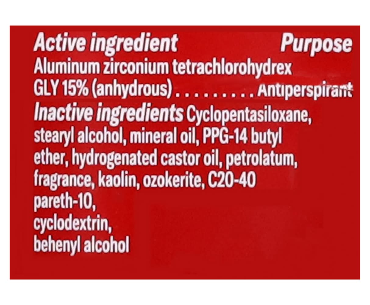 Ingredients: Active Ingredients: Aluminum Zirconium Tetrachlorohydrex GLY (Anhydrous) (15 %), Antiperspirant. Inactive Ingredients: Cyclopentasiloxane, Stearyl Alcohol, Mineral Oil, PPG-14 Butyl Ether, Hydrogenated Castor Oil, Petrolatum, Fragrance, Kaolin, Ozokerite, C20-40 Pareth-10, Cyclodextrin, Behenyl Alcohol