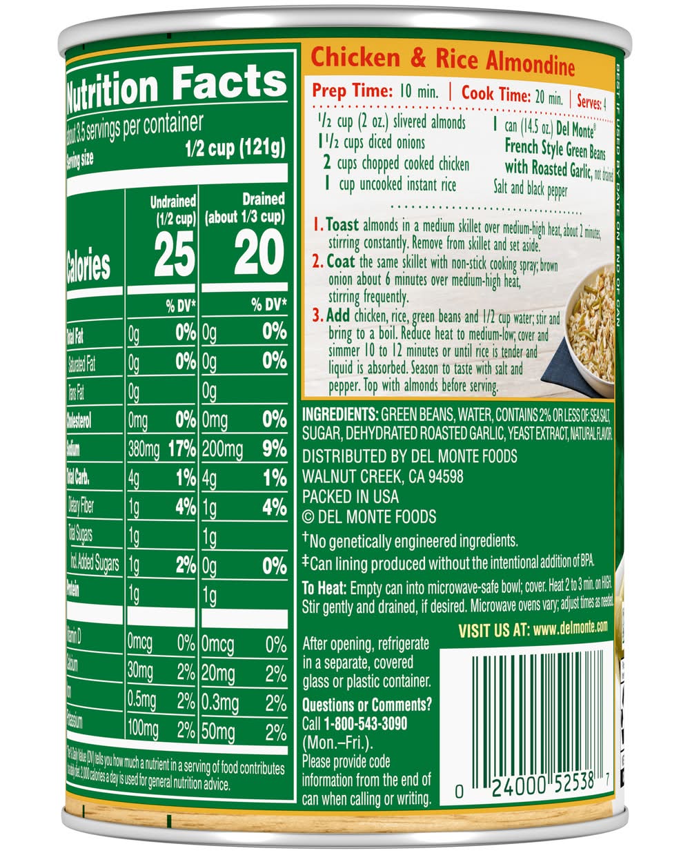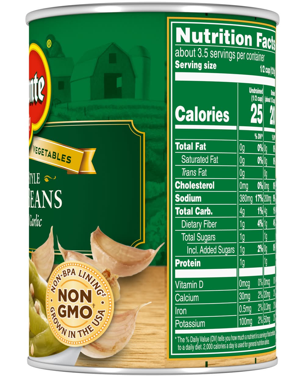 Del Monte French Style Green Beans with Roasted Garlic come from the fertile soils of America, where they are cultivated to reach optimal ripeness. These beans are harvested at their peak and promptly packed to preserve the fresh, home-cooked taste and vital nutrients. The seasoning of roasted garlic enhances the beans' natural flavor, offering a savory side dish option. Packaging: Reusable