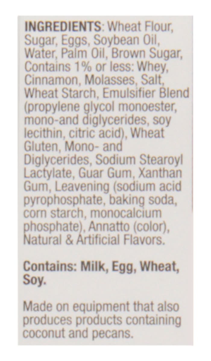 Wheat Flour, Sugar, Eggs, Soybean Oil, Water, Palm Oil, Brown Sugar, Contains 1% or Less: Whey, Cinnamon, Molasses, Salt, Wheat Starch, Emulsifier Blend (Propylene Glycol Monoester, Mono-and Diglycerides, Soy Lecithin, Citric Acid), Wheat Gluten, Mono-and Diglycerides, Sodium Stearoyl Lactylate, Guar Gum, Xanthan Gum, Leavening (Sodium Stearoyl Lactylate, Guar Gum, Xanthan Gum, Leavening (Sodium Acid Pyrophosphate, Baking Soda, Corn Starch, Monocalcium Phosphate), Annatto (Color), Natural & Artificial Flavors Contains: Milk, Eggs, Wheat, Soybeans, Gluten, Corn, Tree Nuts, Coconuts, Tree Nuts, Pecans