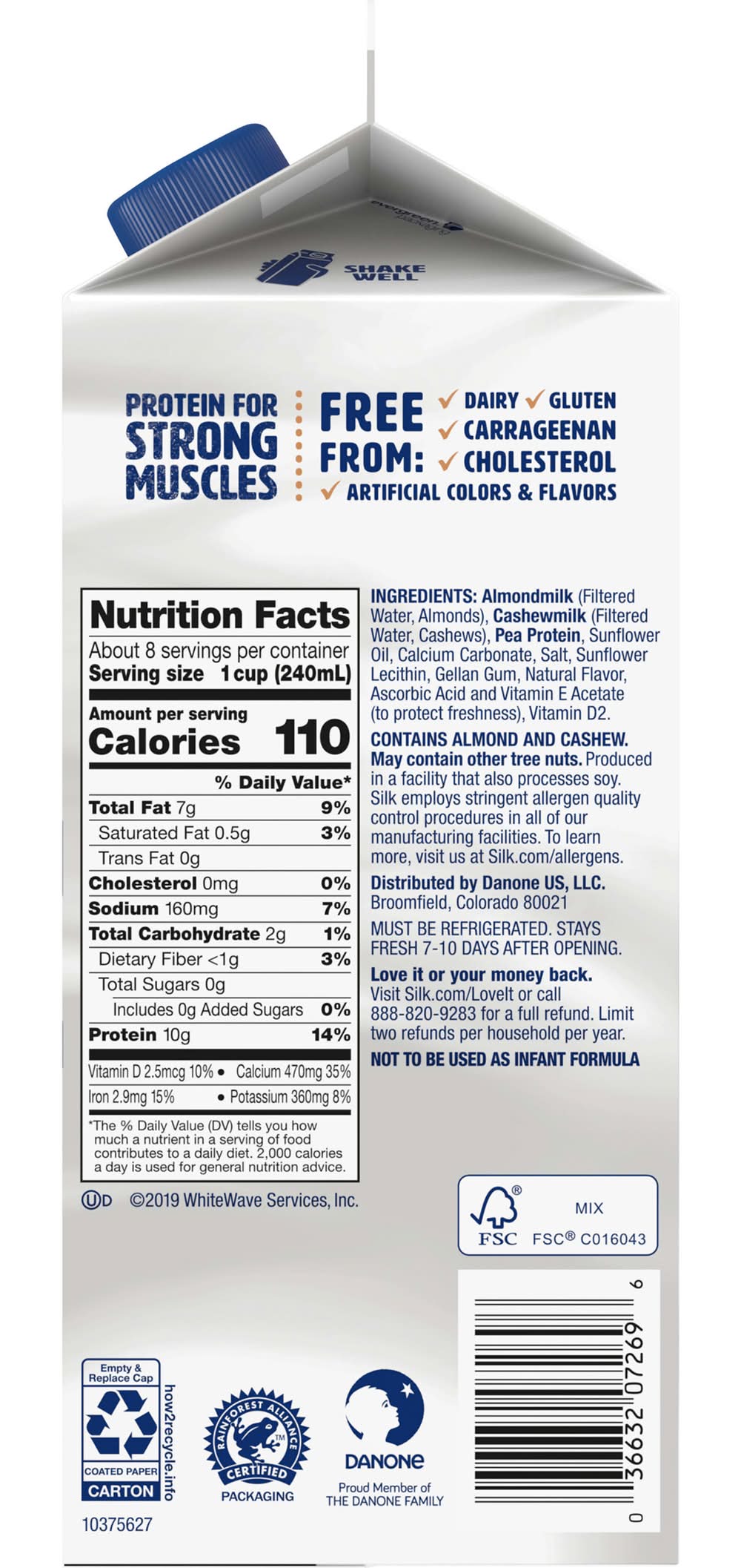 Almondmilk (Filtered Water, Almonds), Cashewmilk (Filtered Water, Cashews), Pea Protein, Sunflower Oil, Calcium Carbonate, Salt, Sunflower Lecithin, Gellan Gum, Natural Flavor, Ascorbic Acid and Vitamin E Acetate (to Protect Freshness), Vitamin D2. Contains: Contains almond and cashew. May contain other tree nuts. Silk employs stringent allergen quality control procedures in all of our manufacturing facilities.