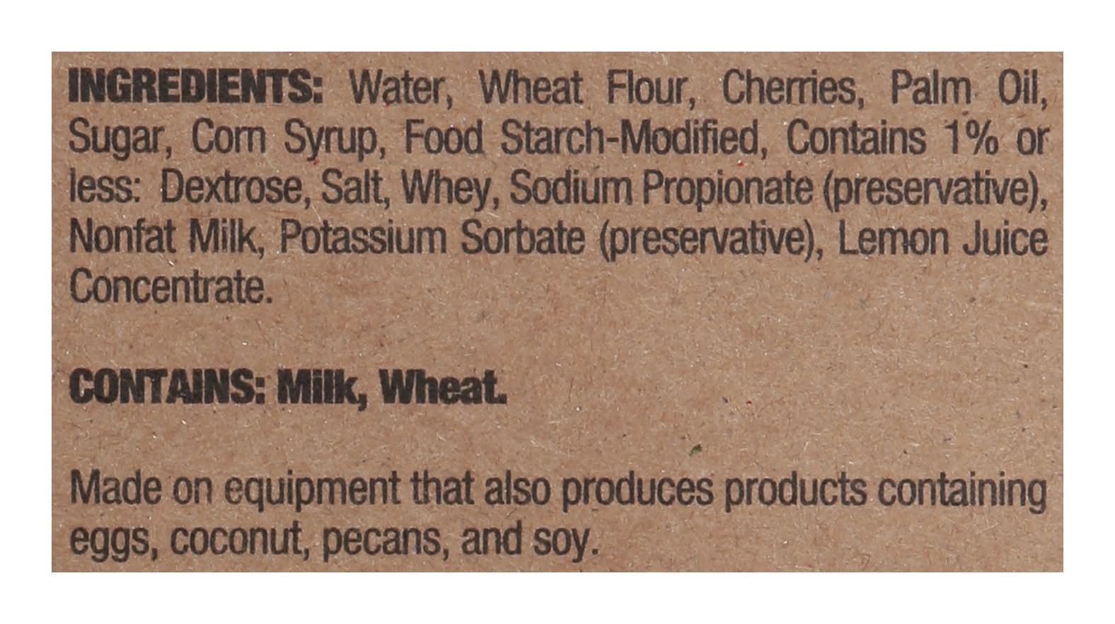 Water, Wheat Flour, Cherries, Palm Oil, Sugar, Corn Syrup, Food Starch-Modified, Contains 1% or Less: Dextrose, Salt, Whey, Sodium Propionate (Preservative), Nonfat Milk, Potassium Sorbate (Preservative), Lemon Juice Concentrate Contains: Milk, Wheat, Corn, Eggs, Tree Nuts, Coconuts, Tree Nuts, Pecans, Soybeans
