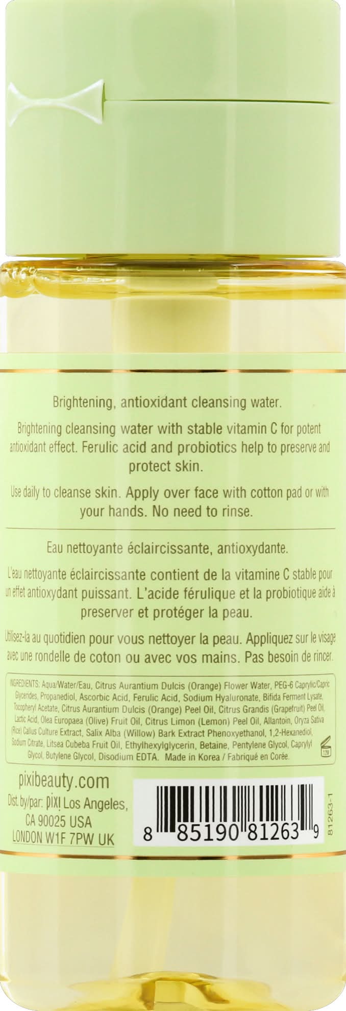 Aqua/Water/Eau, Citrus Aurantium Dulcis (Orange) Flower Water, PEG-6 Caprylic, Capric Glycerides, Propanediol, Ascorbic Acid, Ferulic Acid, Sodium Hyaluronate, Bifida Ferment Lysate, Tocopheryl Acetate, Citrus Aurantium Dulcis (Orange) Peel Oil, Citrus Grandis (Grapefruit) Peel Oil, Lactic Acid, Olea Europaea (Olive) Fruit Oil, Citrus Limon (Lemon) Peel Oil, Allantoin, Oryza Sativa (Rice) Callus Culture Extract, Salix Alba (Willow) Bark Extract Phenoxyethanol, 1 .2-Hexyanediol, Sodium Citrate, Litsea Cubeba Fruit Oil, Ethylhexylglycerin, Betaine, Pentylene Glycol, Caprylyl Glycol, Butylene Glycol, Disodium EDTA