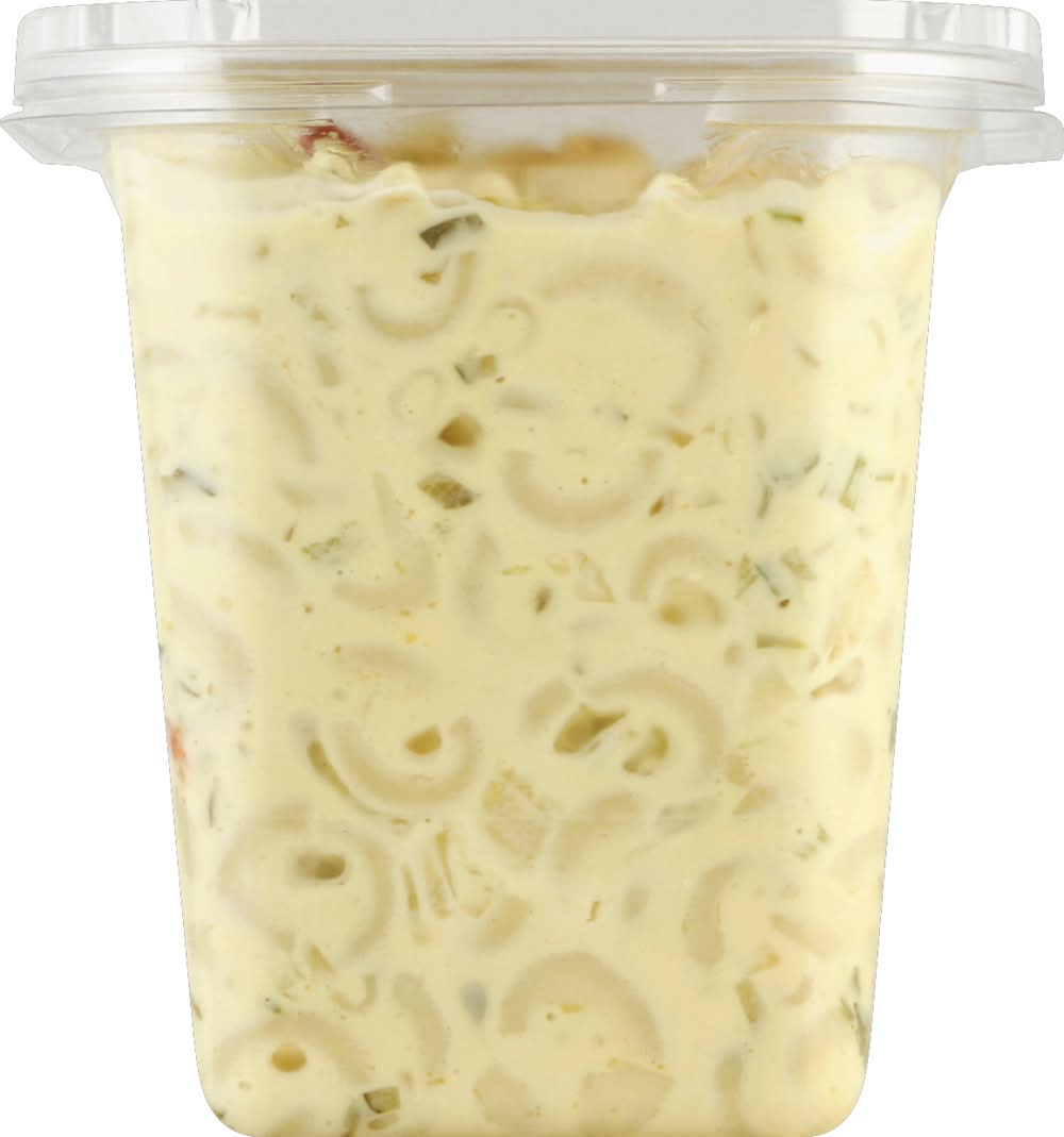 Cooked Macaroni (Semolina Wheat Flour [Enriched with Niacin, Iron, Thiamine Mononitrate, Riboflavin, Folic Acid], Egg White), Mayonnaise (Soybean Oil, Water, Egg Yolks, Vinegar, Salt), Sweet Pickle Relish (Cucumbers, Sugar, Distilled Vinegar, Salt, Contains Less than 2% of: Mustard Seed, Xanthan Gum, Calcium Chloride, Celery Seed, Dehydrated Red Bell Pepper, Natural Flavoring, Turmeric, Minced Onion), Water, Celery, Sugar, Onion, Red Bell Pepper, Salt, Vinegar, Mustard (Water, Vinegar, Mustard Seed, Salt, Sugar, Soybean Oil, Turmeric and Paprika, Garlic Powder, Spices, Xanthan Gum, Annatto Color, Citric Acid, Natural Flavor), Modified Corn Starch, Sodium Benzoate (Preservative), Potassium Sorbate (Preservative), Annatto Color, Xanthan Gum Contains: Eggs, Wheat