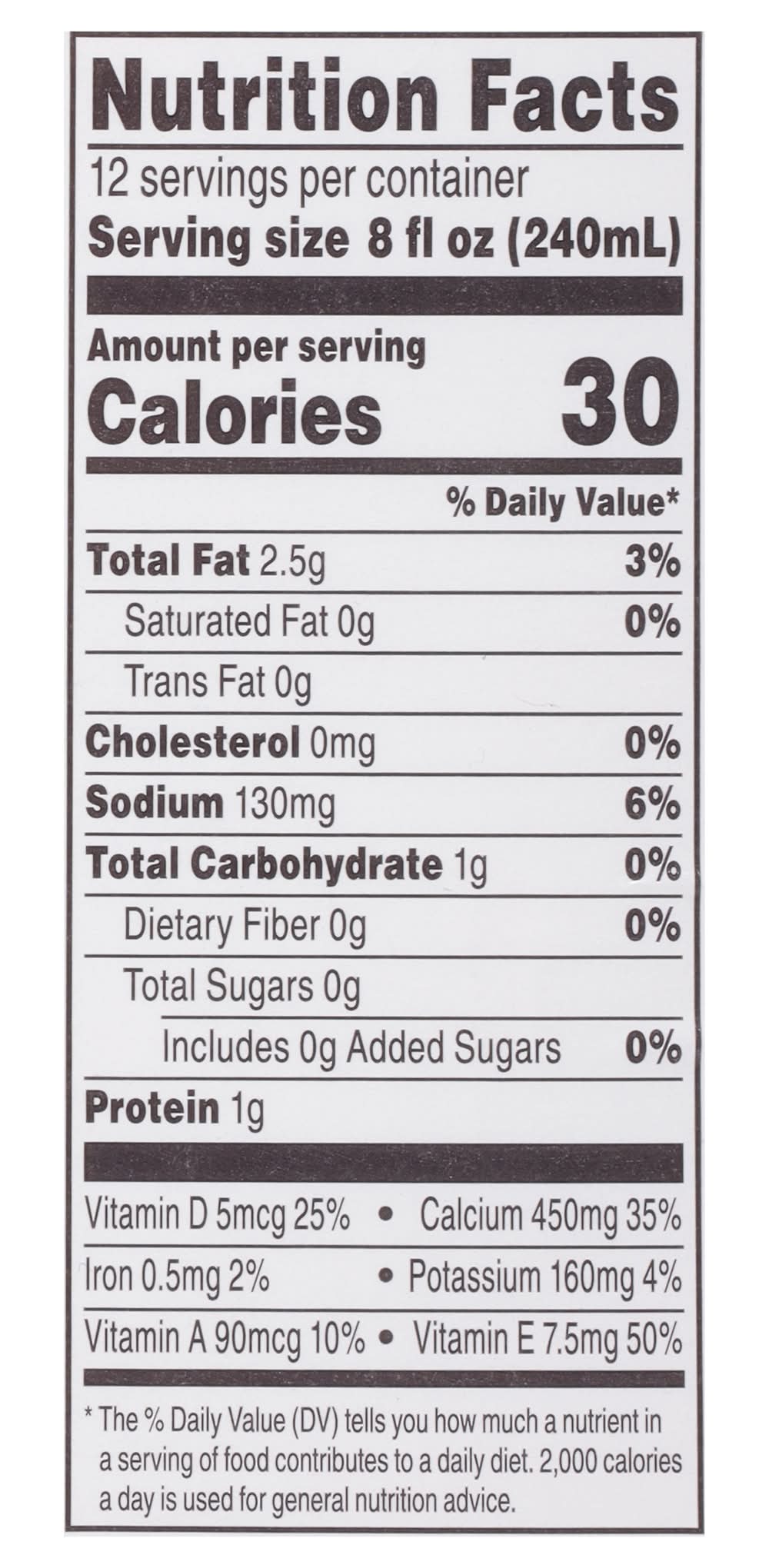 Filtered Water, Almonds, Contains Less than 2% of Calcium Carbonate, Natural Flavors, Sea Salt, Gellan Gum, Dipotassium Phosphate, Sunflower Lecithin, Xanthan Gum, Vitamin A Palmitate, Vitamin D2, D-Alpha Tocopherol (Vitamin E) Contains: Tree Nuts, Almonds