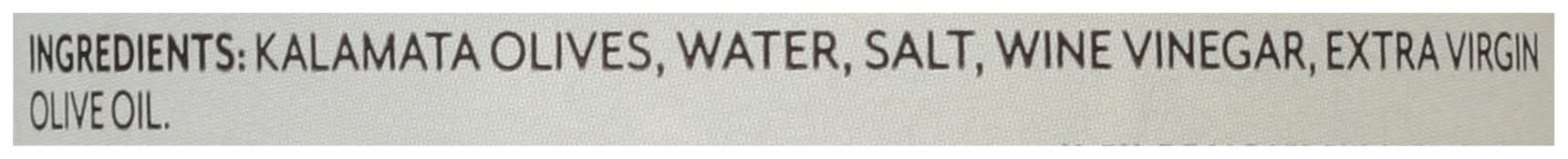 Kalamata Olives, Water, Salt, Wine Vinegar, Extra Virgin Olive Oil Contains: None Additives: None