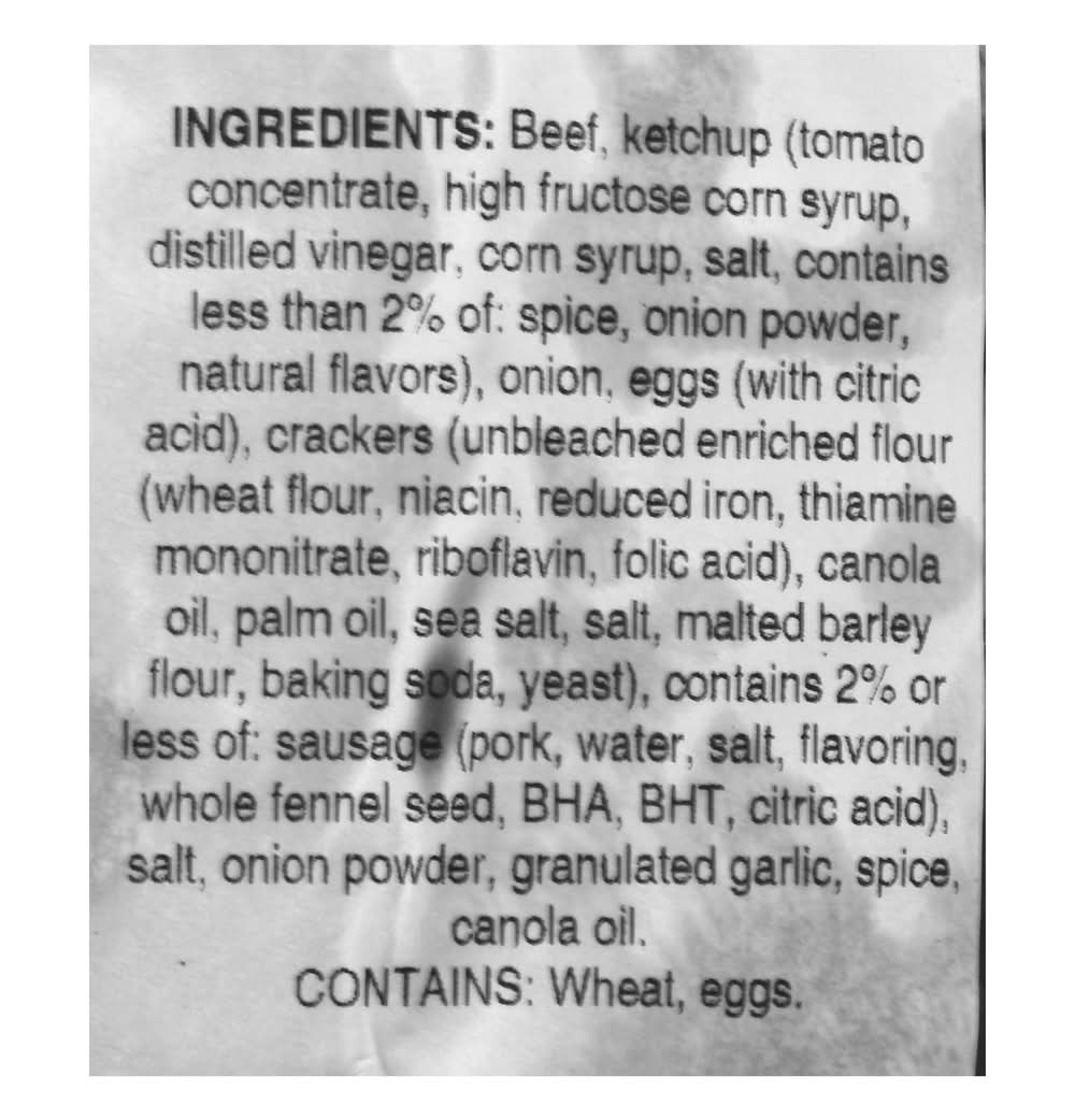 Beef, Ketchup (Tomato Concentrate, High Fructose Corn Syrup, Distilled Vinegar, Corn Syrup, Salt, Contains Less than 2% of: Spice, Onion Powder, Natural Flavors), Onion, Eggs (with Citric Acid), Crackers (Unbleached Enriched Flour [Wheat Flour, Niacin, Reduced Iron, Thiamine Mononitrate, Riboflavin, Folic Acid], Canola Oil, Palm Oil, Sea Salt, Salt, Malted Barley Flour, Baking Soda, Yeast), Contains 2% or Less of: Sausage (Pork, Water, Salt, Flavoring, Whole Fennel Seed, BHA, BHT, Citric Acid), Salt, Onion Powder, Granulated Garlic, Spice, Canola Oil Contains: Wheat, Eggs