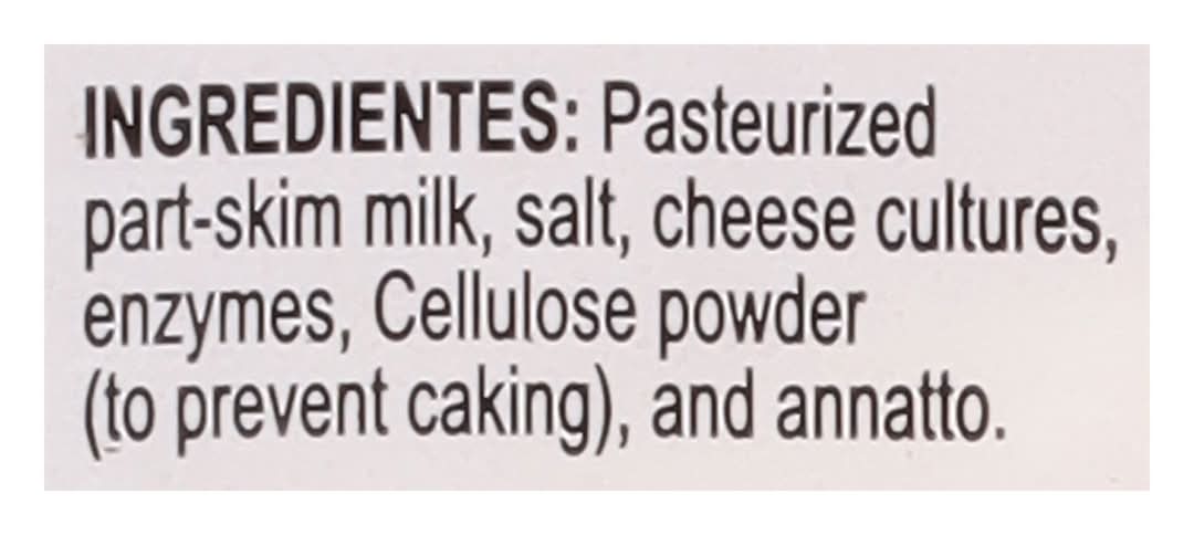 Ingredients: Pasteurized Part-Skim Milk, Salt, Cheese Cultures, Enzymes, Cellulose Powder (to Prevent Caking), and Annatto Contains: Milk