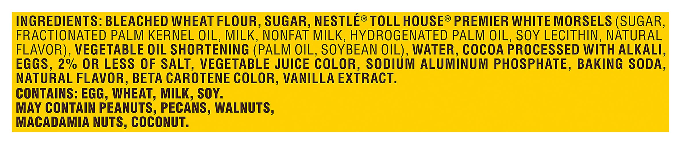 BLEACHED WHEAT FLOUR, SUGAR, NESTLÉ® TOLL HOUSE® PREMIER WHITE MORSELS (SUGAR, FRACTIONATED PALM KERNEL OIL, MILK, NONFAT MILK, HYDROGENATED PALM OIL, SOY LECITHIN, NATURAL FLAVOR), VEGETABLE OIL SHORTENING (PALM OIL, SOYBEAN OIL), WATER, COCOA PROCESSED WITH ALKALI, EGGS, 2% OR LESS OF SALT, VEGETABLE JUICE COLOR, SODIUM ALUMINUM PHOSPHATE, BAKING SODA, NATURAL FLAVOR, BETA CAROTENE COLOR, VANILLA EXTRACT. Contains: CONTAINS: EGG, WHEAT, MILK, SOY. MAY CONTAIN PEANUTS, PECANS, WALNUTS, MACADAMIA NUTS, COCONUT