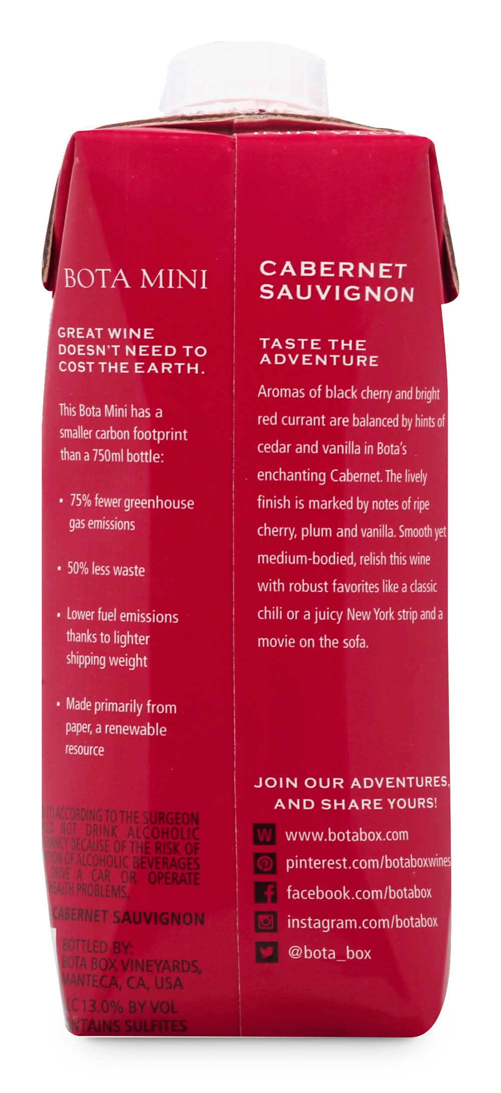 • Alcohol by volume: 13% • Bota Box Vineyards, Manteca, CA, USA. • Packaging: Reusable