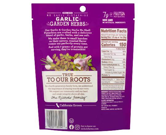 Our Garlic & Garden Herbs No Shell Pistachios are crafted with a delicious blend of garlic, herbs, and sea salt. We make them in small batches so their savory, roasted flavor comes out perfectly every time. And with 7 grams of protein per serving, they're irresistible! Nichols Farms,