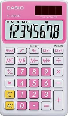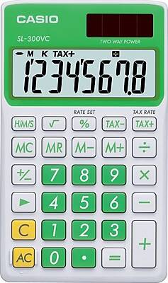 Assorted colors. Color varies by order or store. Specific color cannot be requested.8-digit standard function calculator is perfect for business and home use has solar plus with battery backup power source. The Casio® SL300VC 8-digit standard function calculator with independent memory, incorporates functionalities like percent, profit margin, square root key, change sign (+/-), constants for +, -, x, /. This solar powered calculator comes with battery backup to ensure long hours of uninterrupted performance. This calculator turns off automatically to save the battery energy. It is perfect for business and home use. This calculator offers time and tax calculation. - Assorted colors. Color varies by order or store. Specific color cannot be requested. - 8-Digit standard function calculator for business and home use - Dimensions: 9/32H x 2 3/4W x 4 5/8L - Power source: Solar plus with battery backup - Big display for user convenience - Independent memory, percent, profit margin, square root key, change sign (+/-), constants for +, -, x, / - Auto power off to save energy - Battery: LR54 (LR1130) - Time calculation, tax calculation and 3-digit comma markers - Weight: 6 oz. Safety Data Sheet