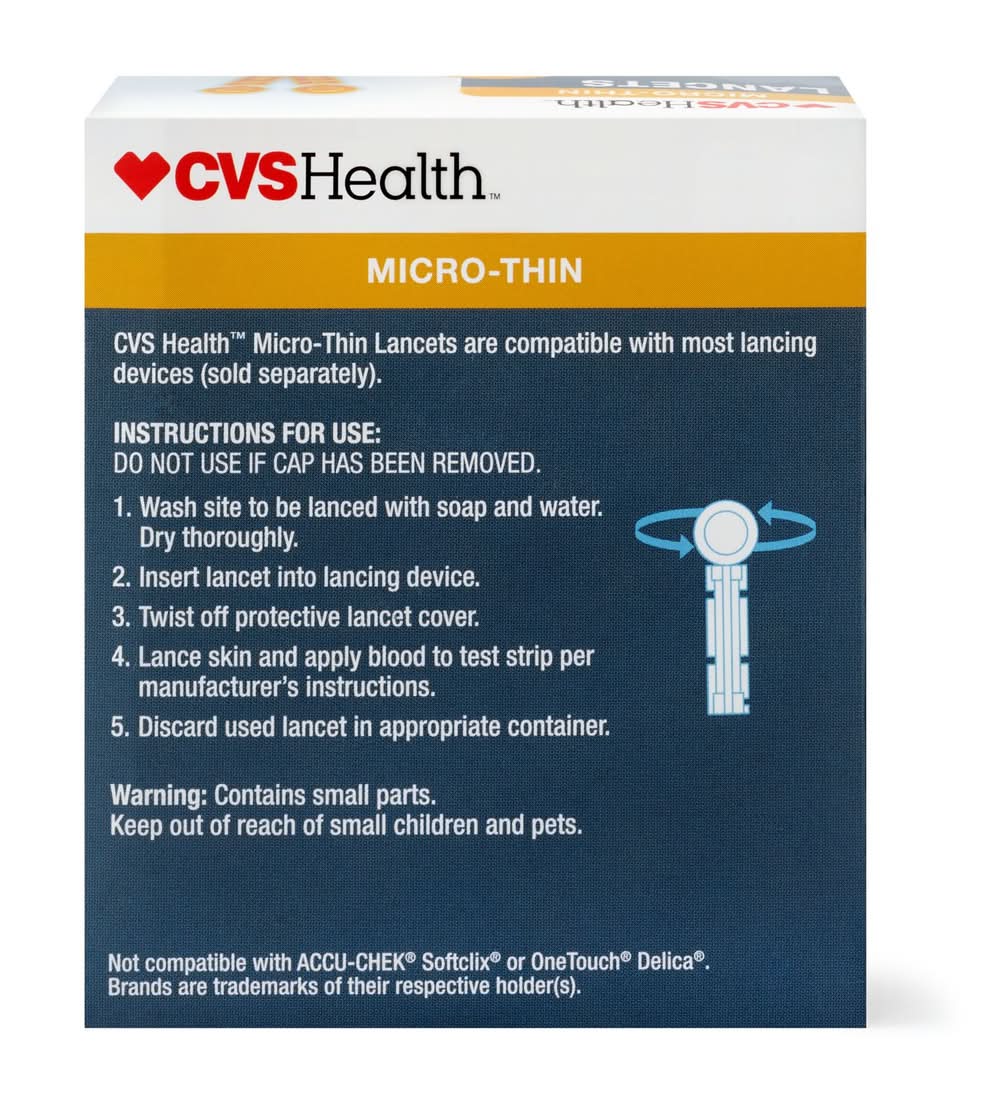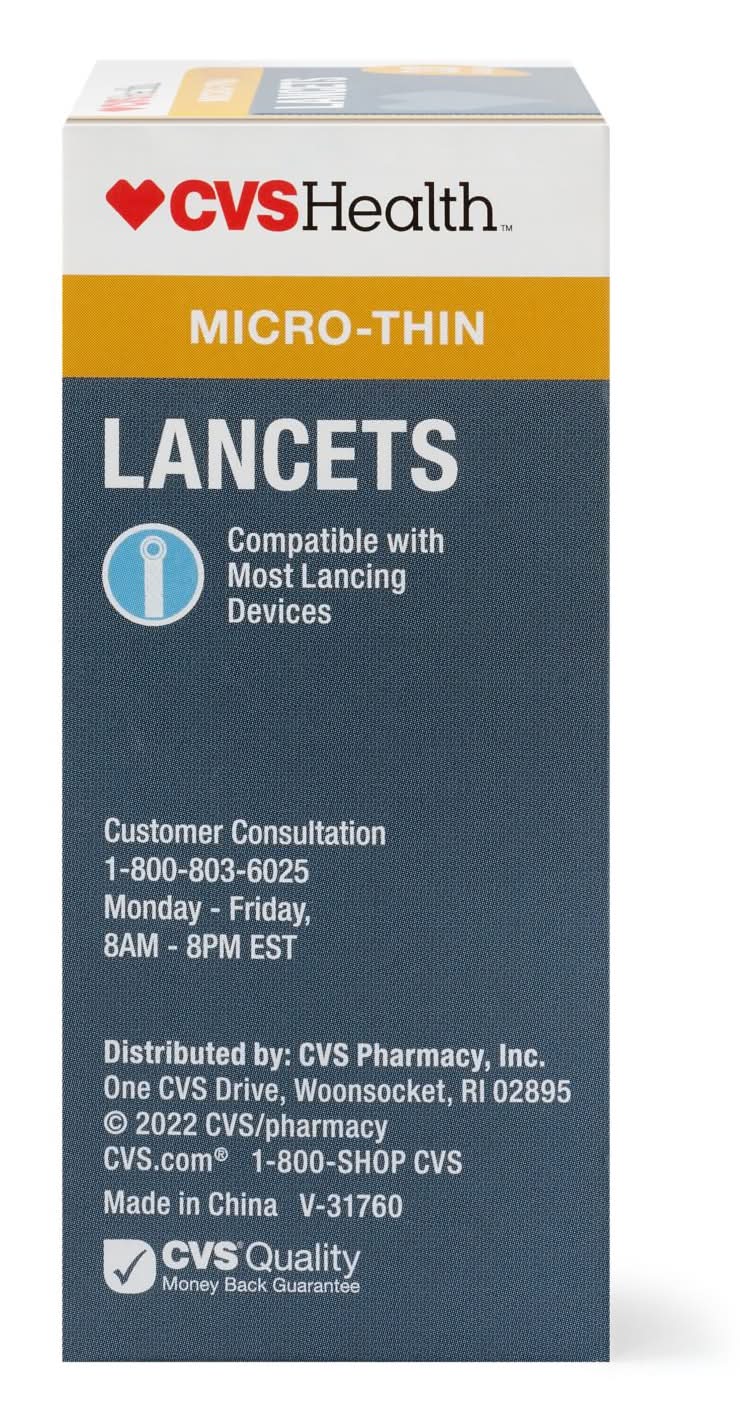 For micro-blood sampling. Compatible with most lancing devices. Single use. CVS/pharmacy Micro Thin Lancets are compatible with CVS/pharmacy lancing devices. Also use with the following devices: OneTouch Lancing Device, Ultra Soft, Penlet Plus; Autolet; BD; FreeStyle; Gentle Draw; Microlet; MediSense; Quik-Let; Soft Touch; TRUEdraw; Vaculance. And many more. Don't see your device? Call 1-800-461-7448 or visit myLancet.com/CVS for a complete list. Not compatible with Accu-Chek Softclix or OneTouch Delica. Quality & comfort guaranteed. CVS quality guarantee. www.cvs.com. Please recycle. Made in China.