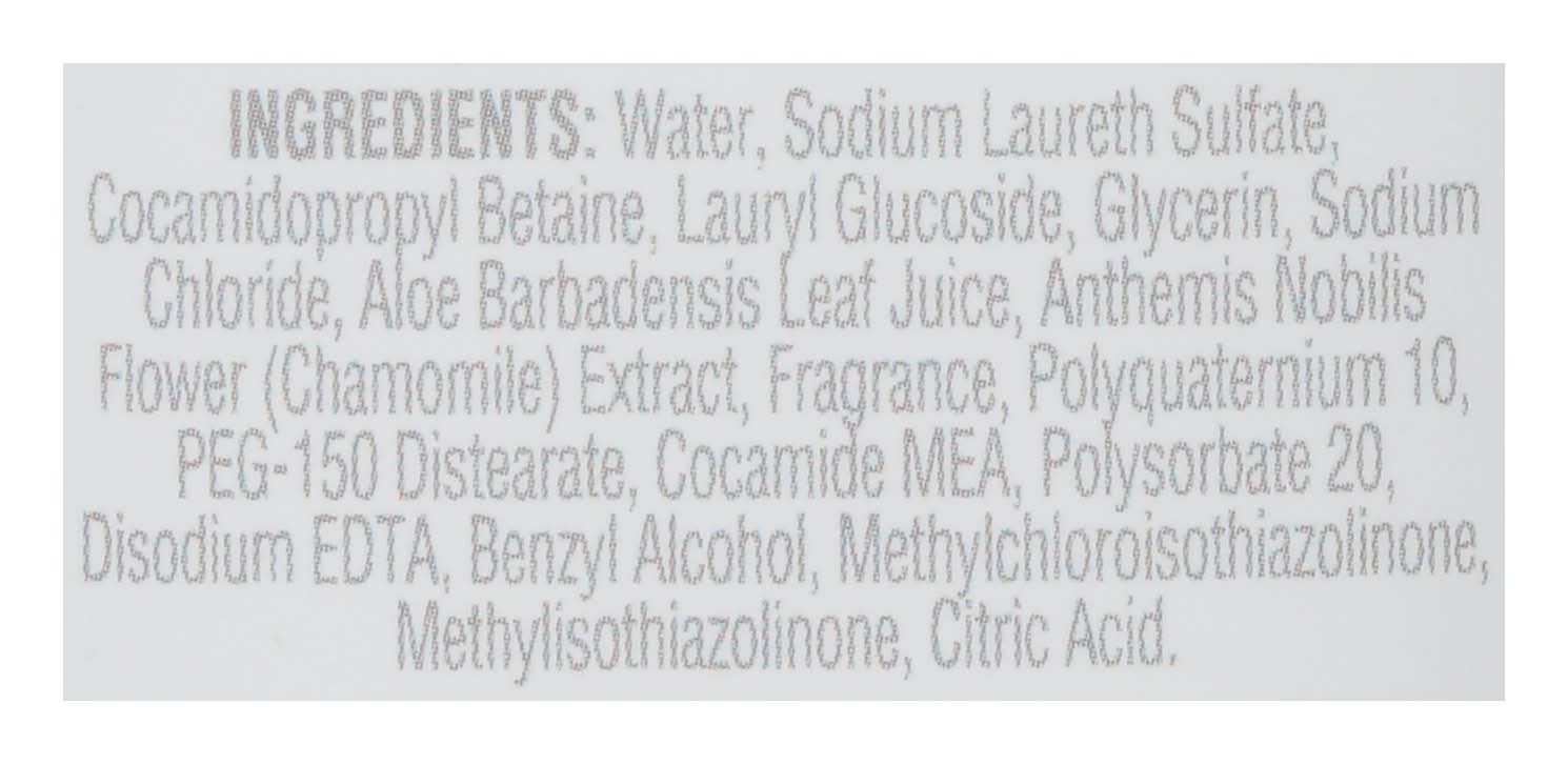 Ingredients: Water, Sodium Laureth Sulfate, Cocamidopropyl Betaine, Lauryl Glucoside, Glycerin, Sodium Chloride, Aloe Barbadensis Leaf Juice, Anthemis Nobilis Flower (Chamomile) Extract, Fragrance, Polyquaternium 10, PEG-150 Distearate, Cocamide MEA, Polysorbate 20, Disodium EDTA, Benzyl Alcohol, Methylchloroisothiazolinone, Methylisothiazolinone, Citric Acid