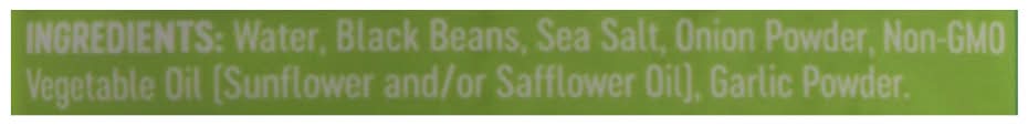 Ingredients: Water, Black Beans, Sea Salt, Onion Powder, Non-GMO Vegetable Oil (Sunflower and/or Safflower Oil), Garlic Powder