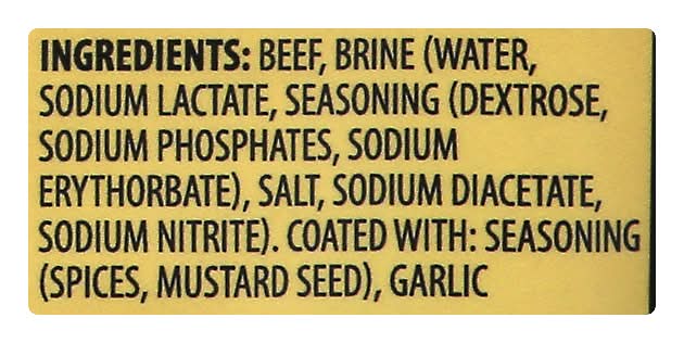 Beef, Brine (Water, Sodium Lactate, Seasoning (Dextrose, Sodium Phosphates, Sodium Erythorbate), Salt, Sodium Diacetate, Sodium Nitrite). Coated with: Seasoning (Spices, Mustard Seed), Garlic Contains: 'Free From Gluten'