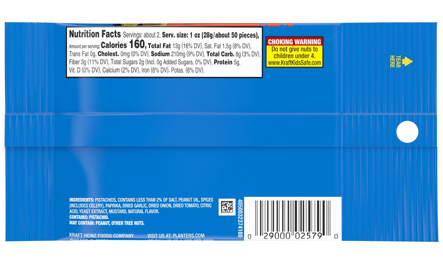 PISTACHIOS, CONTAINS LESS THAN 2% OF SALT, PEANUT OIL, SPICES (INCLUDES CELERY), PAPRIKA, DRIED GARLIC, DRIED ONION, DRIED TOMATO, CITRIC ACID, YEAST EXTRACT, MUSTARD, NATURAL FLAVOR. Contains: CONTAINS: PISTACHIO.