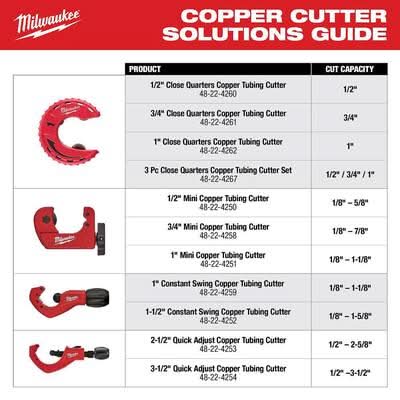 The Milwaukee 1 in. Constant Swing Copper Tubing Cutter is engineered for straighter, cleaner cuts. A 4 Roller Design delivers accurate cuts and prevents walking. For added durability and extended performance, Chrome Rollers provide best in class rust protection. Tool-free blade change allows easy blade replacement on the jobsite. Size: 1 in