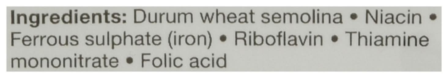 Durum wheat semolina, niacin, ferrous sulphate (iron), riboflavin, thiamine mononitrate, folic acid
