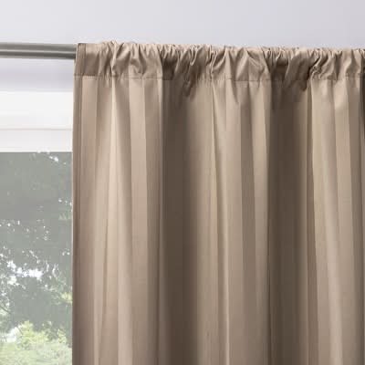 Featuring a satin stripe design, Sun Zero Dimani Curtain Panel Pairs adds style and dimension to any living space. Equipped with rod pockets for easy hanging on standard curtain rods up to 1.5" in diameter. Sun Zero Total Blackout Thermal Insulation is laboratory tested to block out 100% of light, reduce outside noise by up to 40%, and decrease energy lost through your windows by up to 40%. Comfort is optimized with thermal properties that help keep summer heat and winter chill out of your home. Hang in your entertainment room to eliminate screen glare and reduce distracting outside noise, or in your bedroom for enhanced privacy and a sounder, more uninterrupted sleep. Pair includes 2 taupe panels, each measuring 37" width by 84" length. Measure carefully before selecting your desired size and quantity. Rod not included. Machine wash cold on gentle cycle. Use non-chlorine bleach when needed. Tumble dry on low heat, using a cool iron as needed. • Color: Taupe • Size: 37x84 in