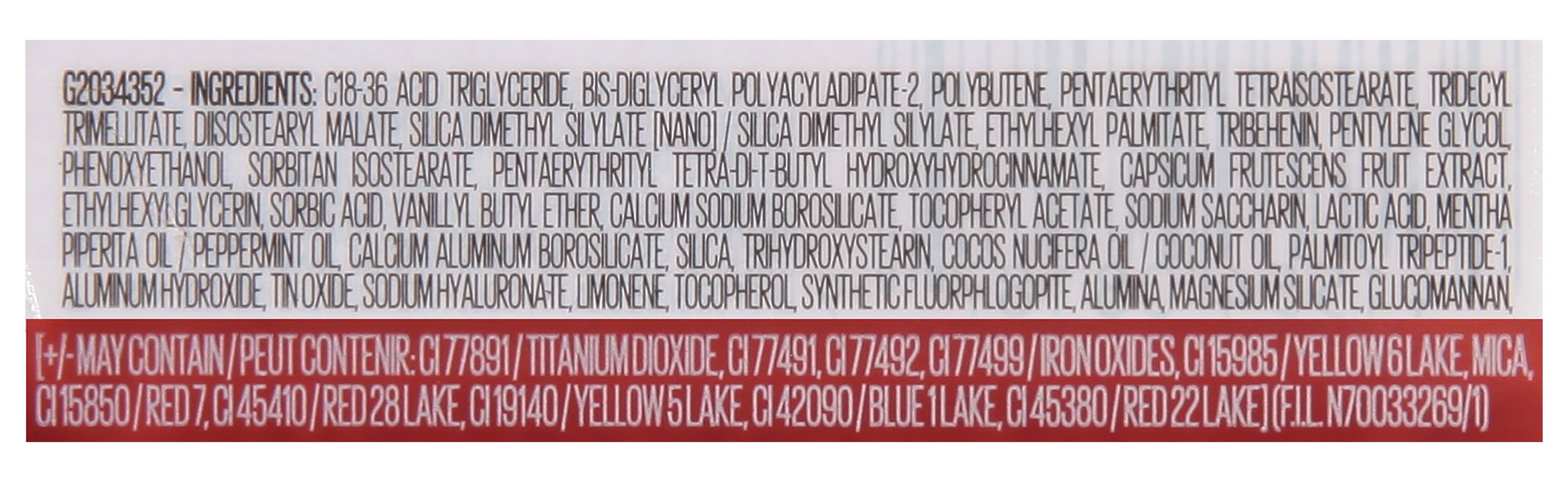 Ingredients: G2034352- C18-36 Acid Triglyceride, Bis-Diglyceryl Polyacyladipate-2, Polybutene, Pentaerythrityl Tetraisostearate, Tridecyl Trimellitate, Disostearyl Malate, Silica Dimethyl Silylate (Nano)/Silica Dimethyl Silylate, Ethylhexyl Palmitate, Tribehenin, Pentylene Glycol, Phenoxyethanol, Sorbitan Isostearate, Pentaerythrityl Tetra-Di-T-Butyl Hydroxyhydrocinnamate, Capsicum Frutescens Fruit Extract, Ethylhexylglycerin, Sorbic Acid, Vanillyl Butyl Ether, Calcium Sodium Borosilicate, Tocopheryl Acetate, Sodium Saccharin, Lactic Acid, Mentha Piperita Oil/Peppermint Oil, Calcium Aluminum Borosilicate, Silica, Trihydroxystearin, Cocos Nucifera Oil/Coconut Oil, Palmitoyl Tripeptide-1, Aluminum Hydroxide, Tin Oxide, Sodium Hyaluronate, Limonene, Tocopherol, Synthetic Fluorphlogopite, Alumina, Magnesium Silicate, Glucomannan, [+/-May Contain: CI 77891/Titanium Dioxide, CI 77491, CI 77492, CI 77499/Iron Oxides, CI 15985/Yellow 6 Lake, Mica, CI 15850/Red 7, CI 45410/Red 28 Lake, CI 19140/Yellow 5 Lake, CI 42090/Blue 1lake, CI 45380/Red 22 Lake]. FIL. N70033269/1 Contains: Tree Nuts, Coconuts