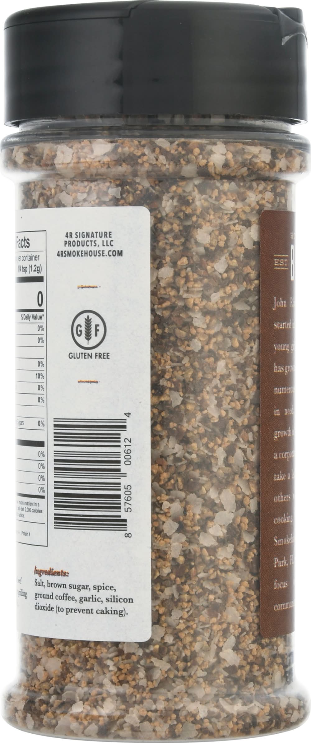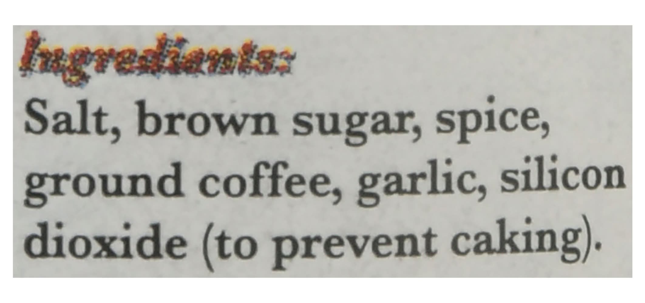 Salt, Brown Sugar, Spice, Ground Coffee, Garlic, Silicon Dioxide (to Prevent Caking)