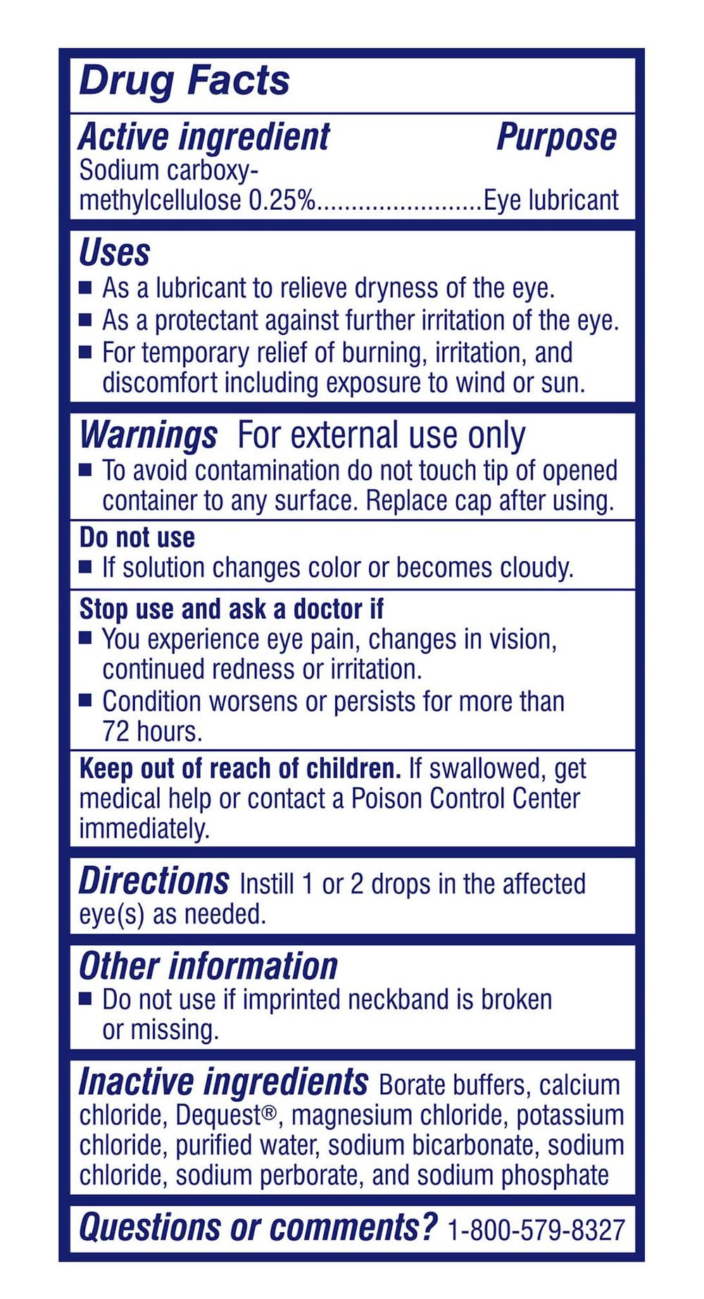Ingredients: Sodium Carboxymethylcellulose (0.25 %), Eye Lubricant.Boric Acid, Calcium Chloride, Dequest 2060S Phosphonate, Magnesium Chloride, Potassium Chloride, Sodium Bicarbonate, Sodium Borate, Sodium Chloride, Sodium Perborate, Sodium Phosphate, Trehalose, and Water for Injection .