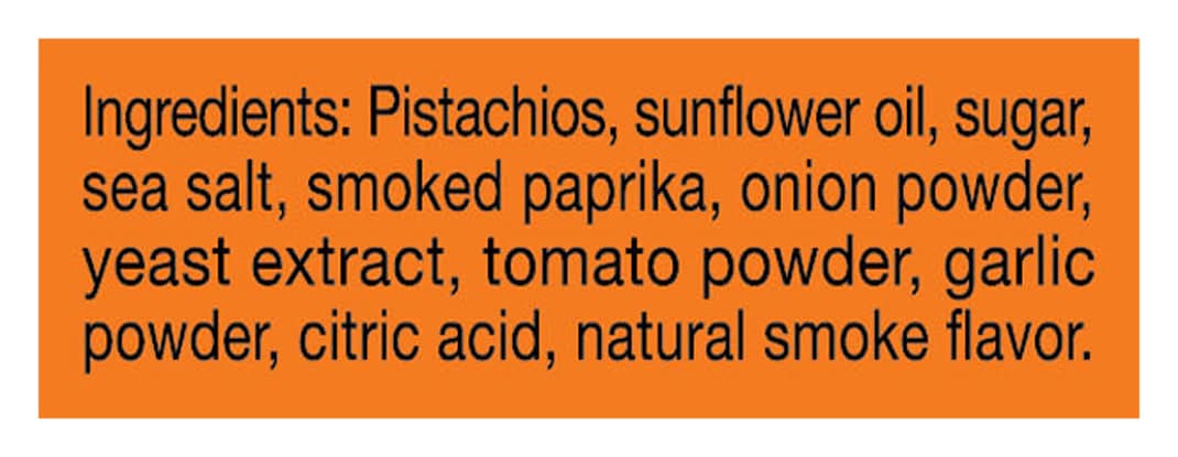 Pistachios, Sunflower Oil, Sugar, Sea Salt, Smoked Paprika, Onion Powder, Yeast Extract, Tomato Powder, Garlic Powder, Citric Acid, Natural Smoke Flavor Contains: Tree Nuts, Pistachios