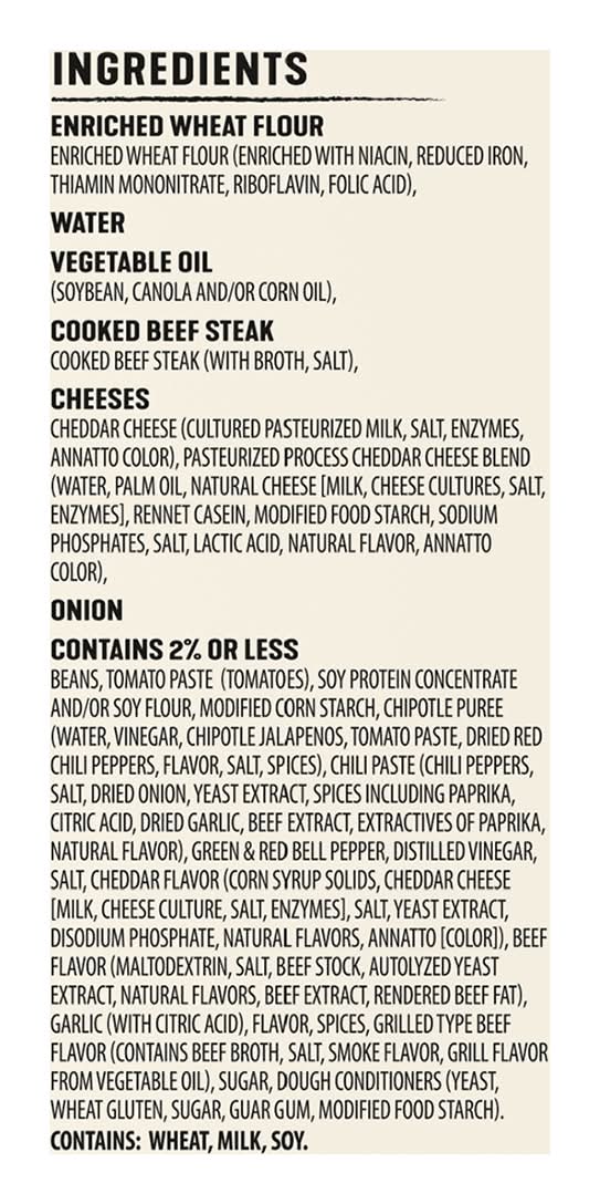 Enriched Wheat Flour: Enriched Wheat Flour (Enriched with Niacin, Reduced Iron, Thiamin Mononitrate, Riboflavin, Folic Acid), Water, Vegetable Oil (Soybean, Canola and/or Corn Oil), Cooked Beef Steak: Cooked Beef Steak (with Broth, Salt), Cheeses: Cheddar Cheese (Cultured Pasteurized Milk, Salt, Enzymes, Annatto Color), Pasteurized Process Cheddar Cheese Blend (Water, Palm Oil, Natural Cheese [Milk, Cheese Cultures, Salt, Enzymes], Rennet Casein, Modified Food Starch, Sodium Phosphates, Salt, Lactic Acid, Natural Flavor, Annatto Color), Onion: Contains 2% or Less Beans, Tomato Paste (Tomatoes), Soy Protein Concentrate and/or Soy Flour, Modified Corn Starch, Chipotle Puree (Water, Vinegar, Chipotle Jalapenos, Tomato Paste, Dried Red Chili Peppers, Flavor, Salt, Spices), Chili Paste (Chili Peppers, Salt, Dried Onion, Yeast Extract, Spices Including Paprika, Citric Acid, Dried Garlic, Beef Extract, Extractives of Paprika, Natural Flavor), Green & Red Bell Pepper, Distilled Vinegar, Salt, Cheddar Flavor (Corn Syrup Solids, Cheddar Cheese [Milk, Cheese Culture, Salt, Enzymes], Salt, Yeast Extract, Disodium Phosphate, Natural Flavors, Annatto [Color]), Beef Flavor (Maltodextrin, Salt, Beef Stock, Autolyzed Yeast Extract, Natural Flavors, Beef Extract, Rendered Beef Fat), Garlic (with Citric Acid), Flavor, Spices, Grilled Type Beef Flavor (Contains Beef Broth, Salt, Smoke Flavor, Grill Flavor from Vegetable Oil), Sugar, Dough Conditioners (Yeast, Wheat Gluten, Sugar, Guar Gum, Modified Food Starch) Contains: Wheat, Milk, Soybeans, Gluten