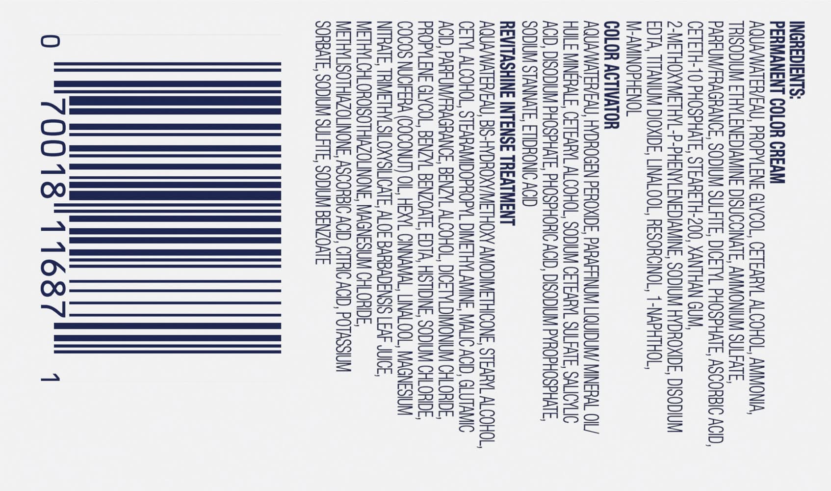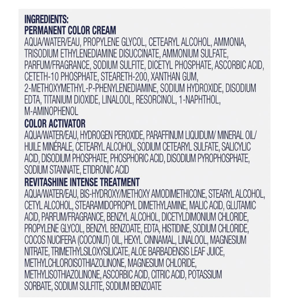 Ingredients: Permanent Color Cream: Aqua/Water/Eau, Propylene Glycol, Cetearyl Alcohol, Ammonia, Trisodium Ethylenediamine Disuccinate, Ammonium Sulfate, Parfum/Fragrance, Sodium Sulfite, Dicetyl Phosphate, Ascorbic Acid, Ceteth-10 Phosphate, Steareth-200, Xanthan Gum, 2-Methoxymethyl-P-Phenylenediamine, Sodium Hydroxide, Disodium EDTA, Titanium Dioxide, Linalool, Resorcinol, 1-Naphthol, M-Aminophenol. Color Activator: Aqua/Water/Eau, Hydrogen Peroxide, Paraffinum Liquidum/Mineral Oil/Huile Minerale, Cetearyl Alcohol, Sodium Cetearyl Sulfate, Salicylic Acid, Disodium Phosphate, Phosphoric Acid, Disodium Pyrophosphate, Sodium Stannate, Etidronic Acid. Revitashine Intense Treatment Aqua/Water/Eau, Bis-Hydroxy/Methoxy Amodimethicone, Stearyl Alcohol, Cetyl Alcohol, Stearamidopropyl Dimethylamine, Malic Acid, Glutamic Acid, Parfum/Fragrance, Benzyl Alcohol, Dicetyldimonium Chloride, Propylene Glycol, Benzyl Benzoate, EDTA, Histidine, Sodium Chloride, Cocos Nucifera (Coconut) Oil, Hexyl Cinnamal, Linalool, Magnesium Nitrate, Trimethylsiloxysilicate, Aloe Barbadensis Leaf Juice, Methylchloroisothiazolinone, Magnesium Chloride, Methylisothiazolinone, Ascorbic Acid, Citric Acid, Potassium Sorbate, Sodium Sulfite, Sodium Benzoate Contains: Sulfites