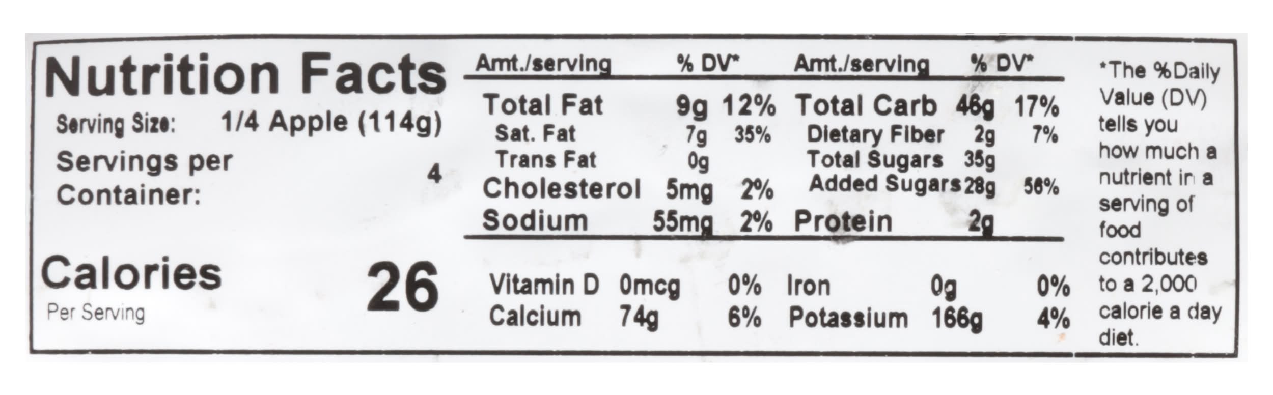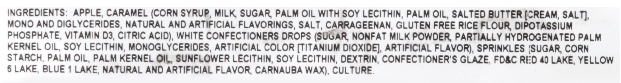 Apple, Caramel (Corn Syrup, Milk, Sugar, Palm Oil with Soy Lecithin, Palm Oil, Salted Butter [Cream, Salt], Mono and Diglycerides, Natural and Artificial Flavorings, Salt, Carrageenan, Gluten Free Rice Flour, Dipotassium Phosphate, Vitamin D3, Citric Acid), White Confectioners Drops (Sugar, Nonfat Milk Powder, Partially Hydrogenated Palm Kernel Oil, Soy Lecithin, Monoglycerides, Artificial Color [Titanium Dioxide), Artificial Flavor), Sprinkles (Sugar, Corn Starch, Palm Oil, Palm Kernel Oil, Sunflower Lecithin, Soy Lecithin, Dextrin, Confectioner's Glaze, FD&C Red 40 Lake, Yellow 6 Lake, Blue 1 Lake, Natural and Artificial Flavor, Carnauba Wax), Culture Contains: Corn, Milk, Soybeans, Peanuts, Tree Nuts, Wheat