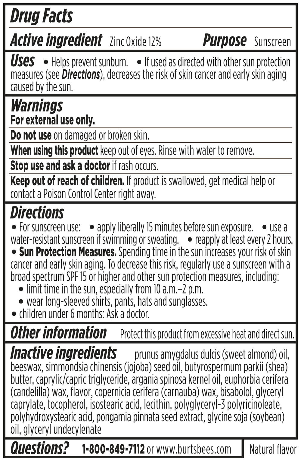 Active Ingredient Zinc Oxide 12%... Sunscreen Inactive ingredients: prunus amygdalus dulcis (sweet almond) oil, beeswax, simmondsia chinensis (jojoba) seed oil, butyrospermum parkii (shea) butter, caprylic/capric triglyceride, argania spinosa kernel oil, euphorbia cerifera (candelilla) wax, flavor*, copernicia cerifera (carnauba) wax, bisabolol, glyceryl caprylate, tocopherol, isostearic acid, lecithin, polyglyceryl-3 polyricinoleate, polyhydroxystearic acid, pongamia pinnata seed extract, glycine soja (soybean) oil, glyceryl undecylenate *natural flavor