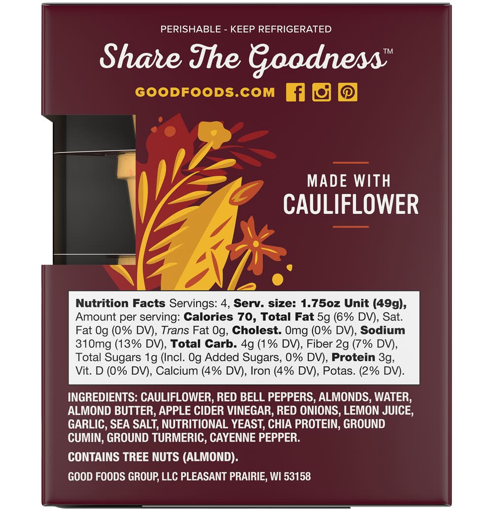 Cauliflower, Red Bell Peppers, Almonds, Water, Almond Butter, Apple Cider Vinegar, Red Onions, Lemon Juice, Garlic, Sea Salt, Nutritional Yeast, Chia Protein, Ground Cumin, Ground Turmeric, Cayenne Pepper Contains: Tree Nuts Additives: None