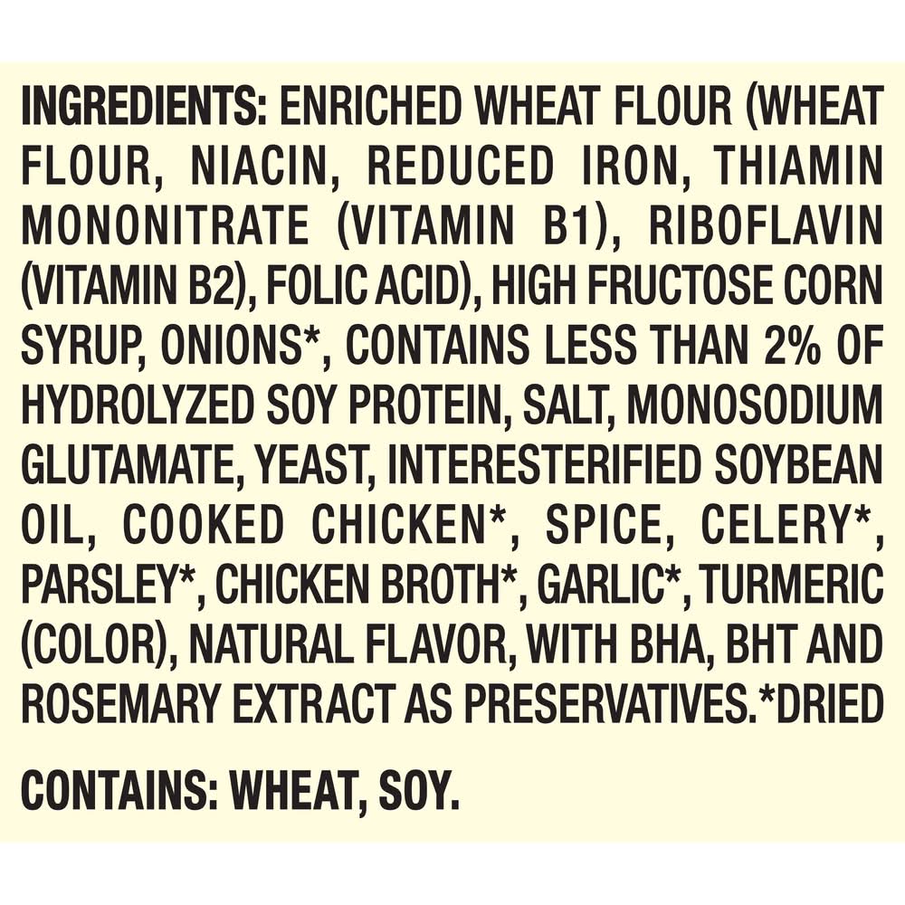 Ingredients: Enriched Wheat Flour (Wheat Flour, Niacin, Reduced Iron, Thiamin Mononitrate (Vitamin B1), Riboflavin (Vitamin B2), Folic Acid), High Fructose Corn Syrups, Onions (Dried), Contains Less than 2% of Hydrolyzed Soy Protein, Salt, Monosodium Glutamate, Yeast, Interesterified Soybean Oil, Cooked Chicken (Dried), Spice, Celery (Dried), Parsley (Dried), Chicken Broth (Dried), Garlic (Dried), Turmeric (Color), Natural Flavor, with BHA, BHT and Rosemary Extract as Preservatives Contains: Gluten, Soy, Wheat