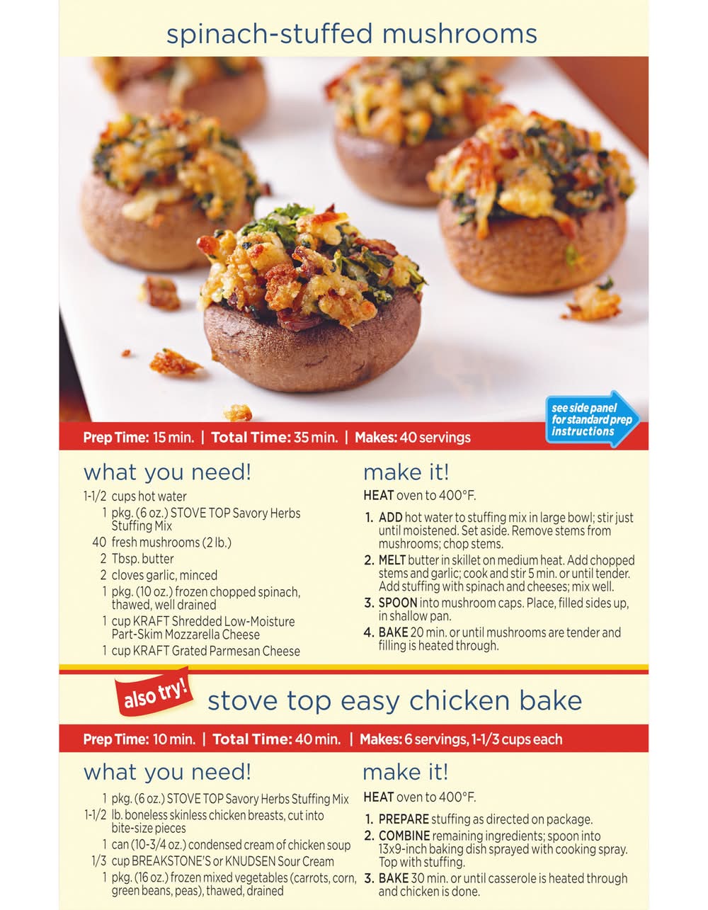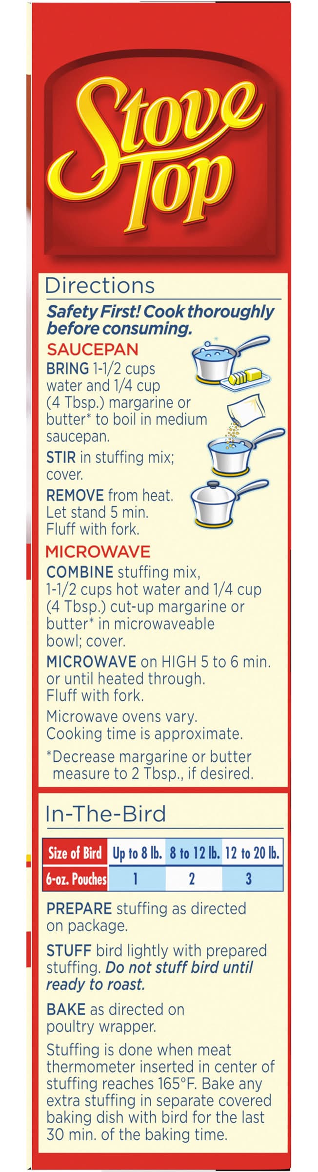 Make every family dinner something to celebrate with Stove Top Savory Herbs Stuffing Mix. Made with real herbs and spices, our stuffing mix keeps all your family members happy during a Thanksgiving meal. Although stuffing is a Thanksgiving must, you can enjoy Stove Top any time of the year. Serve by itself as a side dish to chicken or use in your recipes to help elevate any dish. • Flavor: Savory herbs • Kraft Heinz Foods Company, Chicago,IL,60601, • Packaging: Reusable